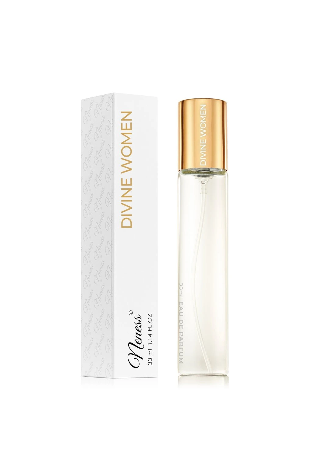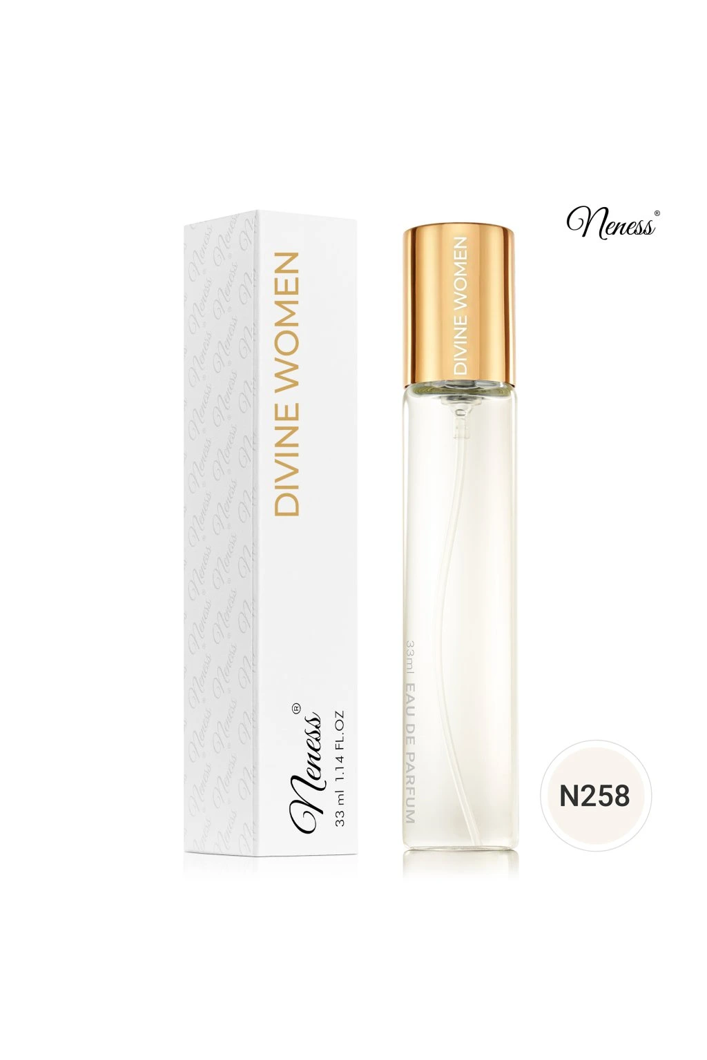 Gyümölcs chypre illat klasszikus 33 ml-es üvegben. A Neness Divine Woman harmónia és elegancia hullámait hozza világodba. A pacsuli, a zöldalma és a frissítő citrom illatával nyit, amelyek a virágzó kert frissességébe vonzzák. A rózsaszín bors és az ibolya csillogást és egy csipetnyi fűszerességet ad ehhez a keverékhez. Ha az illat szívébe megy, felfedezheti a szantálfa, az érzéki rózsa, a szantálfa és a finom pézsma meleg kombinációját. A végső összhangot az őszibarack, a lédús feketeribizli és a napfényes orgona édes jegyei alkotják, amelyek bódító ilang-ilanggal és mély ámbra jegyekkel keverednek, hogy végső kifinomult, mégis csábító benyomást keltsenek. Ez a parfüm a természetes elegancia és kifinomultság ünnepe.